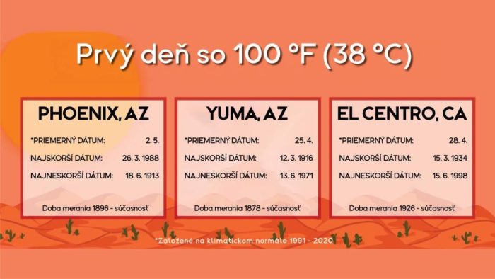 Obr. 2: Najskoršie, najneskoršie a priemerné dosiahnutie teploty 100 °F (38 °C) pre Phoenix a Yumu (Arizona) a El Centro (Kalifornia). Zdroj: weather.gov