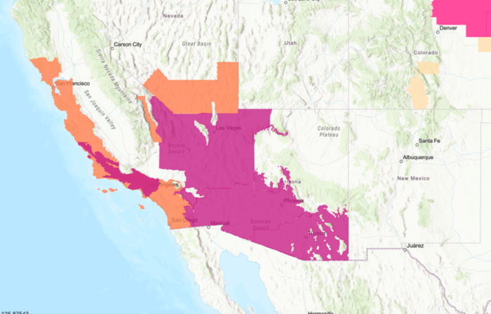 Obr. 1: Výstrahy pred horúčavami pre oblasti Kalifornie, Arizony a Nevady.
