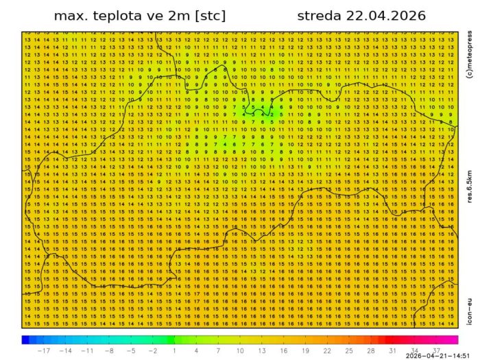 Obr. 4 Maximálna denná teplota podľa modelu ICON-EU.