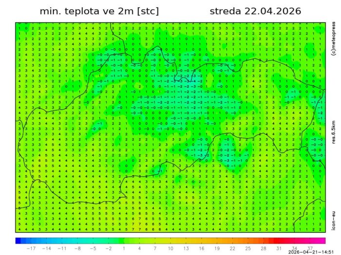 Obr. 3 Minimálna nočná teplota podľa modelu ICON-EU.