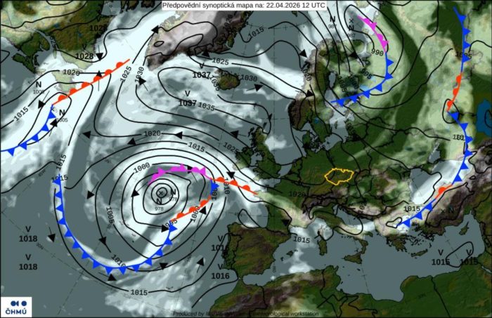 Obr. 1 Synoptická analýza na stredu 21.4.2026. Zdroj: ČHMÚ.