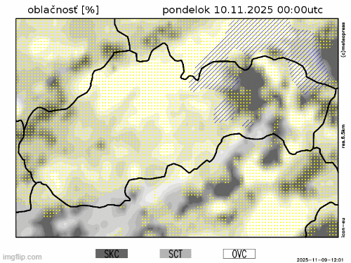 Obr. 2: Predpokladaný vývoj oblačnosti na Slovensku v pondelok (10. 11.) podľa modelu ICON