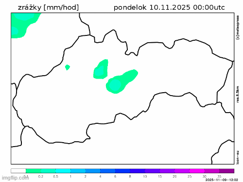 Obr. 3: Predpokladaný vývoj zrážkovej aktivity na Slovensku v pondelok (10. 11.) podľa modelu ICON