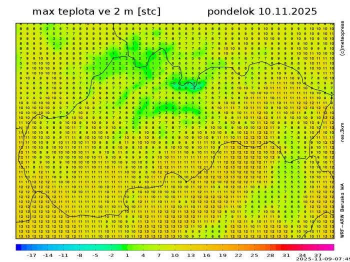 Obr. 5: Predpokladané maximálne teploty vzduchu v pondelok (10. 11.) podľa modelu WRF