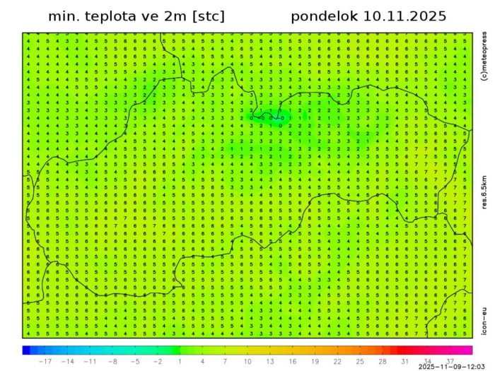 Obr. 4: Predpokladané minimálne teploty vzduchu v pondelok (10. 11.) podľa modelu ICON