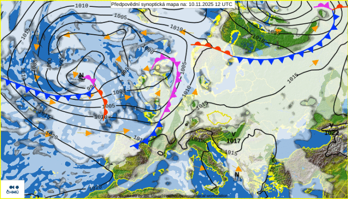 Obr.1: Synoptická situácia – pondelok (10. 11.)