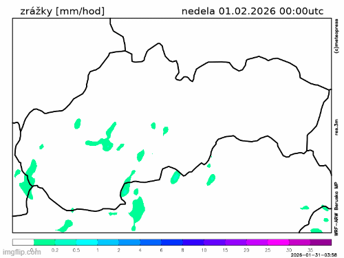 Obr. 3: Predpokladaný vývoj zrážok na Slovensku v nedeľu (1. 2.) podľa modelu WRF
