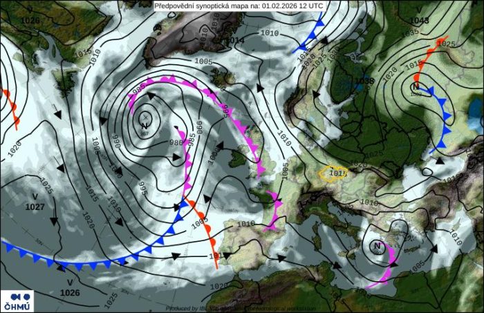 Obr. 1: Synoptická situácia – nedeľa (1. 2.)