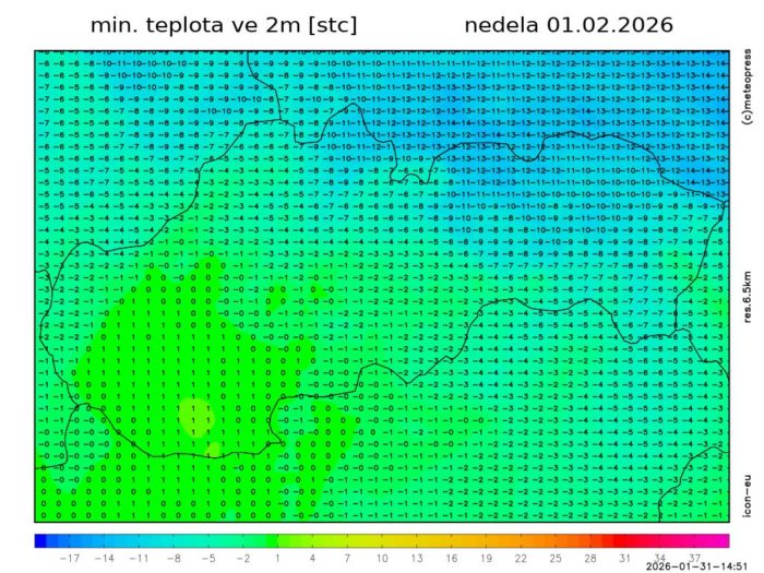 Obr. 5: Predpokladaná minimálna teplota vzduchu v nedeľu (1. 2.) podľa modelu ICON-EU