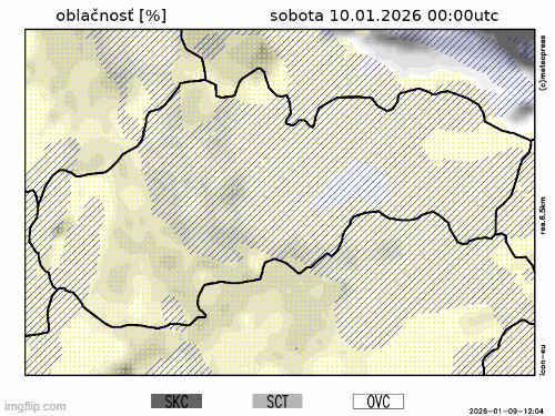 V noci oblačno až zamračené, len ojedinele zmenšená oblačnosť. Miestami slabé sneženie alebo snehové prehánky. Cez deň oblačno až zamračené, ojedinele, najmä na juhu, zmenšená oblačnosť. Miestami slabé sneženie alebo snehové prehánky.