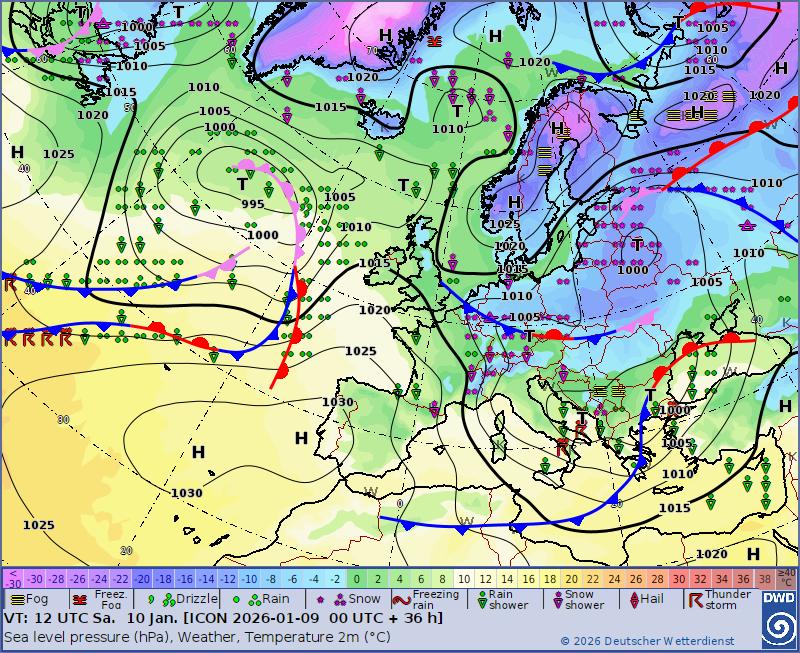 Obr. 1 Synoptická analýza na sobotu 10.1.2026. Zdroj: DWD.de
