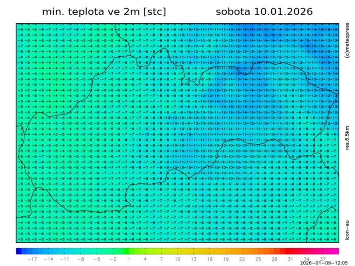 Obr. 3 Minimálna nočná teplota podľa modelu ICON-EU.