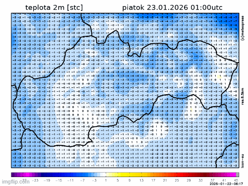 Obr. 2: Predpoveď teploty v 2 m podľa modelu ICON v období od 23. do 25. januára (dopoludnia).