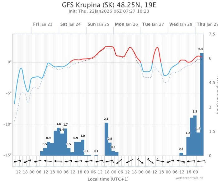 Obr. 5: Predpoveď počasia podľa modelu GFS pre Krupinu v období od 22. do 29. januára. Zdroj: wetterzentrale.de