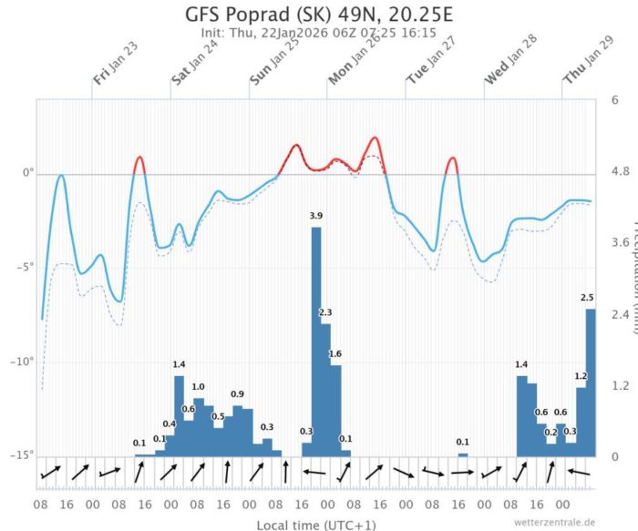 Obr. 4: Predpoveď počasia podľa modelu GFS pre Poprad v období od 22. do 29. januára. Zdroj: wetterzentrale.de