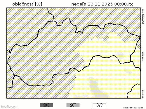 Obr. 2: Predpokladaný vývoj oblačnosti na Slovensku v nedeľu (23. 11.) podľa modelu ICON