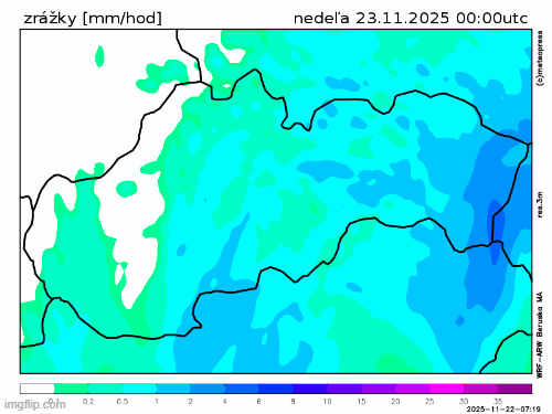 Obr. 3: Predpokladaný vývoj zrážkovej aktivity na Slovensku v nedeľu (23. 11.) podľa modelu WRF