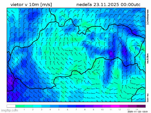 Obr. 4: Predpokladaný vývoj smeru a rýchlosti vetra na Slovensku v nedeľu (23. 11.) podľa modelu ICON