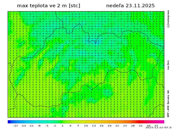Obr. 6: Predpokladané maximálne teploty vzduchu v nedeľu (23. 11.) podľa modelu WRF