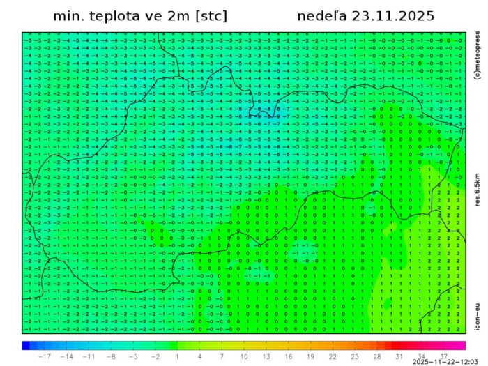 Obr. 5: Predpokladané minimálne teploty vzduchu v nedeľu (23. 11.) podľa modelu ICON