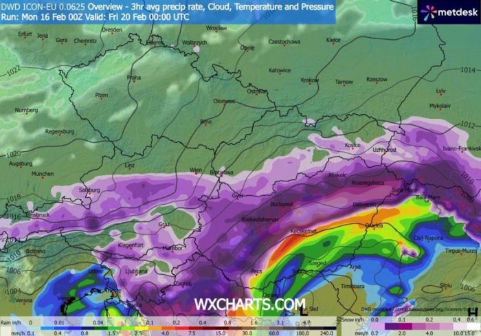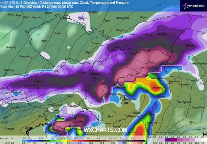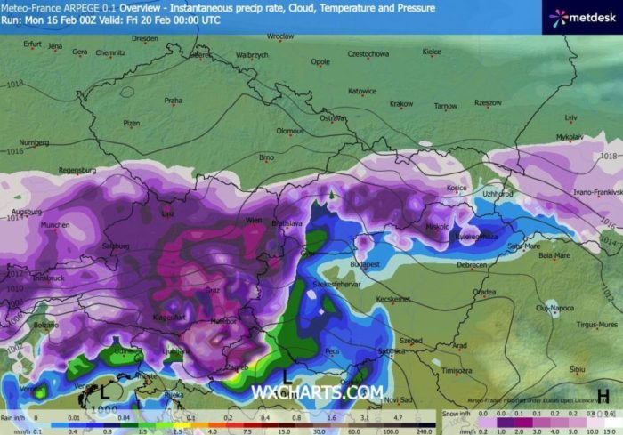 Znamená to, že viaceré lokality Slovenska môže potenciálne zasiahnuť veľmi výdatné sneženie. Rôzne modely dávajú polohu rozhrania práve nad naše územie, pričom napr. model ICON, tie najvýraznejšie presúva nad Maďarsko. Ak by naopak postúpilo o niečo severnejšie, môžu byť najmä na juhu zaznamenaná zrážky aj vo forme dažďa alebo dažďa so snehom. Miestami by však mohlo pripadnúť 10 až 30 cm snehu. Vylúčený však nie je ani scenár s iba okrajovým zásahom Slovenska snežením alebo naopak skôr výskyt mrznúcich zrážok.