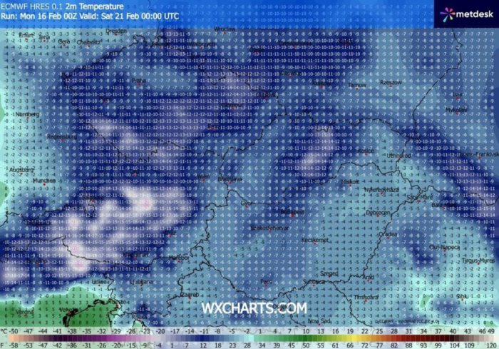 Obr. 10: Predpoveď teploty v 2 m na sobotu, 01:00 hod. podľa modelu ECMWF HRES. Zdroj: wxcharts.com