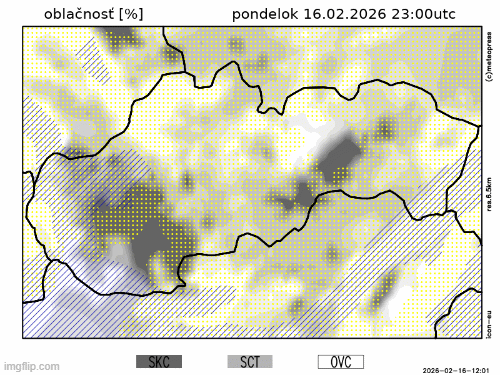 Víkend začne zmenšenou oblačnosťou a chladným ránom. V sobotu ráno by mohlo byť v niektorých dolinách a kotlinách pri vyjasnení a utíšení severného vetra -15 až -20 °C. Inak bude teplota klesať zväčša na -7 až -13, iba lokálne bude vplyvom vetra a oblačnosti teplejšie. V poradí druhé víkendové ráno by už malo byť podstatne teplejšie, aj keď naďalej mrazivé. Pomôže tomu ďalšia oblačnosť a teplejšie prúdenie. Najmä v nedeľu sa opäť očakáva miestami sneženie alebo dážď so snehom, v nížinách neskôr aj dážď. Na západe by sa mohlo v nedeľu otepliť aj na okolo 6 °C.