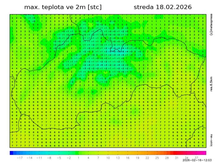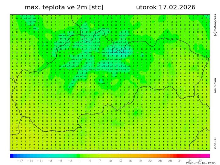 V stredu môže byť ešte teplejšie s maximami na juhu a východe okolo 5, na severe zostane okolo 1 °C.