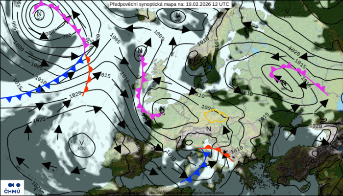 Obr. 5: Predpoveď synoptickej situácie na štvrtok, 19. februára. Zdroj: ČHMÚ