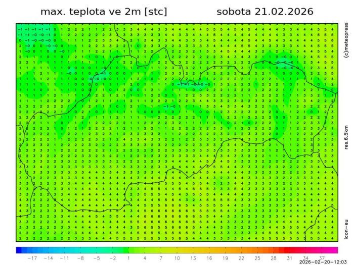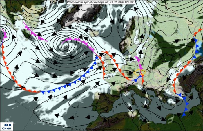 Obr. 1 Synoptická analýza na sobotu 20.2.2026. Zdroj: ČHMÚ.