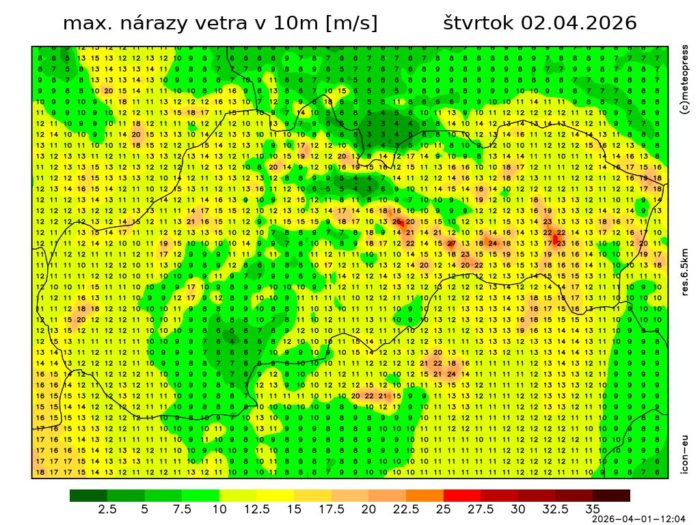 Obr. 4: Predpokladané maximálne nárazy vetra na Slovensku vo štvrtok (2. 4.) podľa modelu ICON-EU