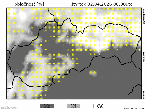 Obr. 2: Predpokladaný vývoj oblačnosti na Slovensku vo štvrtok (2. 4.) podľa modelu ICON-EU