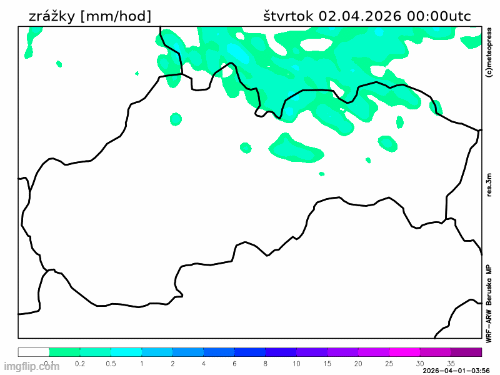 Obr. 3: Predpokladaný vývoj zrážok na Slovensku vo štvrtok (2. 4.) podľa modelu WRF