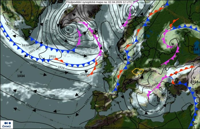 Obr. 1: Predpoveď synoptickej situácie na štvrtok (2. 4.).