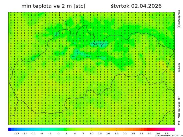 Obr. 5: Predpokladaná minimálna teplota vzduchu vo štvrtok (2. 4.) podľa modelu WRF