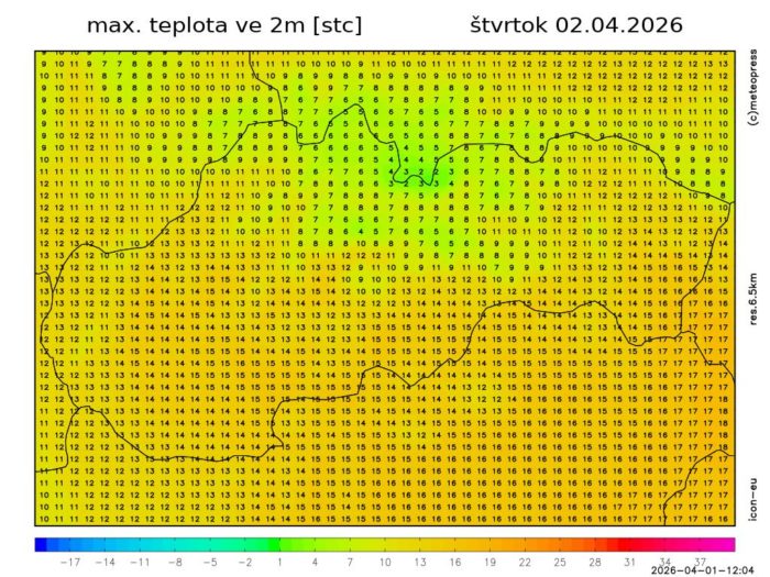 Obr. 6: Predpokladaná maximálna teplota vzduchu vo štvrtok (2. 4.) podľa modelu ICON-EU