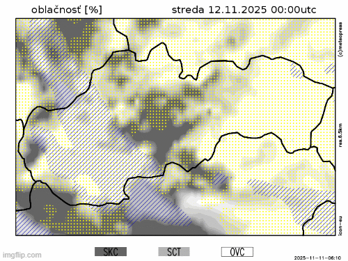 Obr. 2: Predpokladaný vývoj oblačnosti na Slovensku v stredu (12. 11.) podľa modelu ICON-EU