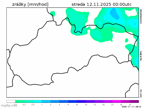 Obr. 3: Predpokladaný vývoj zrážok na Slovensku v stredu (12. 11.) podľa modelu ICON-EU