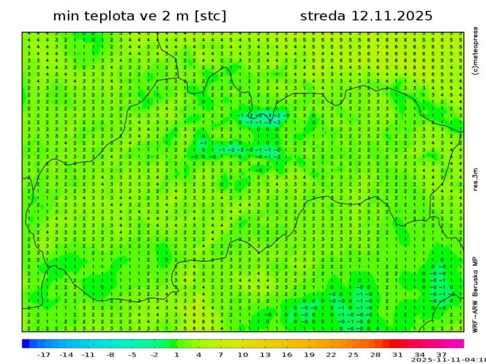Obr. 4: Predpokladaná minimálna teplota vzduchu v stredu (12. 11.) podľa modelu WRF
