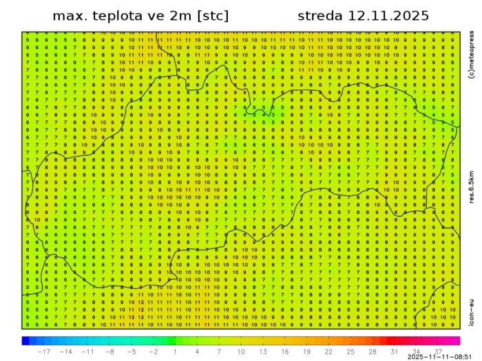 Obr. 5: Predpokladaná maximálna teplota vzduchu v stredu (12. 11.) podľa modelu ICON-EU