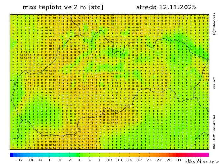 Obr. 7: Predpokladané maximálne teploty vzduchu v stredu (12. 11.) podľa modelu WRF