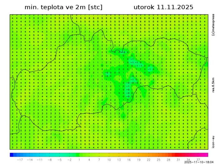 Obr. 3: Predpokladané minimálne teploty vzduchu v utorok (11. 11.) podľa modelu ICON
