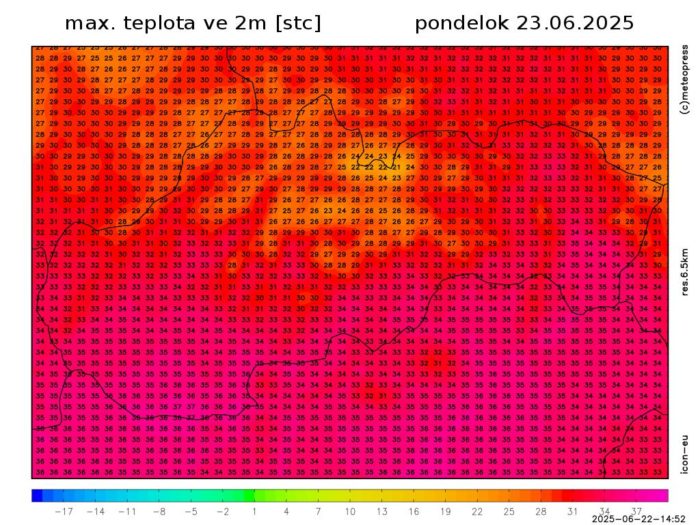 Obr. 6: Predpokladaná maximálna teplota vzduchu v pondelok (23. 6.) podľa modelu ICON-EU