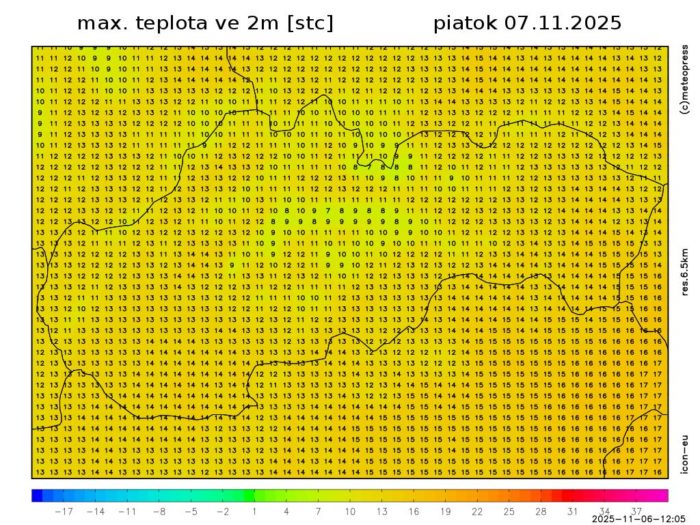 Obr. 2: Predpoveď maximálnej dennej teploty podľa modelu ICON v 2 m v piatok, 7. novembra.