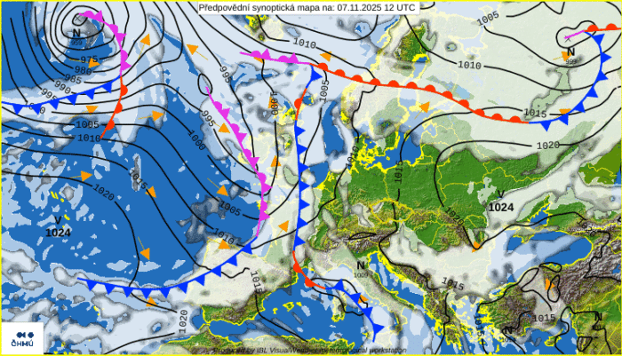 Obr. 1: Predpoveď synoptickej situácie na piatok, 7. novembra. Zdroj: ČHMÚ