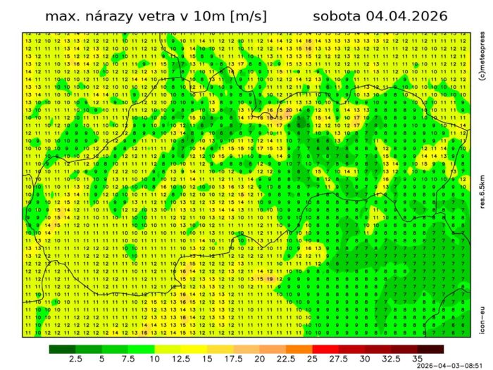 Obr. 3: Predpoveď maximálnych nárazov vetra v 10 m podľa modelu ICON.