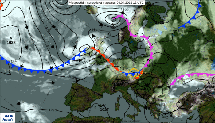 Obr. 1: Predpoveď synoptickej situácie na štvrtok, 4. apríla. Zdroj: ČHMÚ