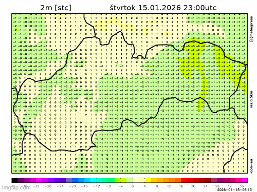 Obr. 2: Predpoveď teploty v 2 m na piatok a sobotu (16. a 17. januára) podľa modelu ICON.