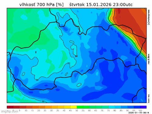 Obr. 3: Predpoveď vlhkosti v hladine 700 hPa (asi 3000 m) na piatok a sobotu (16. a 17. januára) podľa modelu ICON.