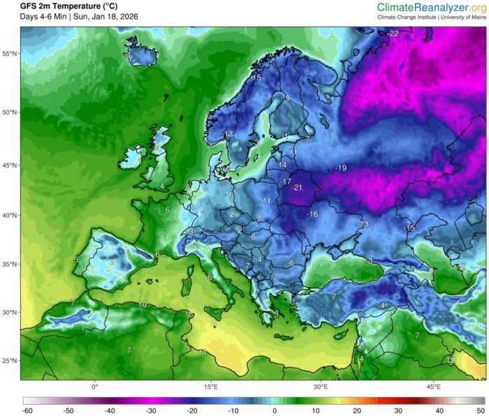 Obr. 4: Priemerné minimá teploty v období od nedele 18. januára, do utorka 20. januára, podľa modelu GFS. Zdroj: CliamateReanalyzer